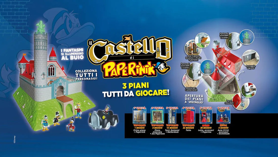 Nel 2024, per celebrare i 90 anni di Paperino, Panini Comics presenta un gadget speciale: il Castello di Paperinik. Allegato al settimanale "Topolino", questo modello in miniatura del famoso rifugio del supereroe Disney è perfetto per collezionisti e fan.