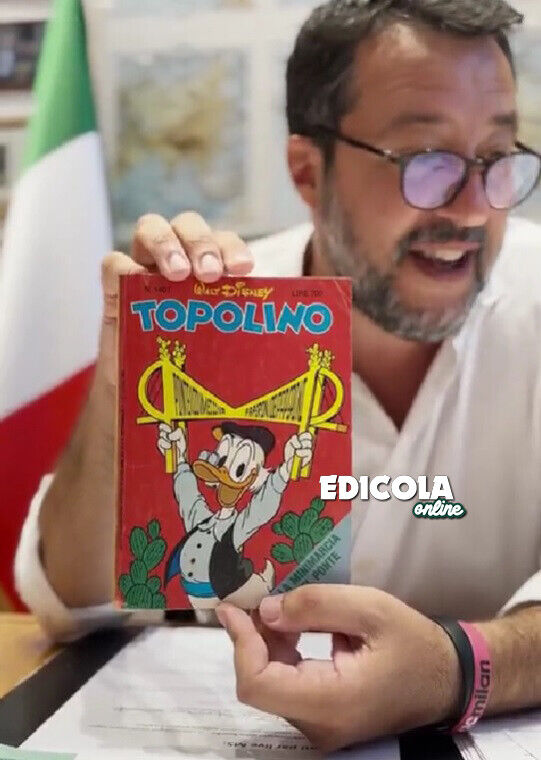 «Il y a ce Mickey Mouse de 1982... qui célébrait les chantiers et les travaux du pont sur le détroit de Messine. 41 ans ont passé et il n'y a aucune trace du pont, même si les projets ont déjà coûté de l'argent aux Italiens." En fait, oui, ce numéro du célèbre magazine de bandes dessinées Disney parlait du pont sur le détroit.