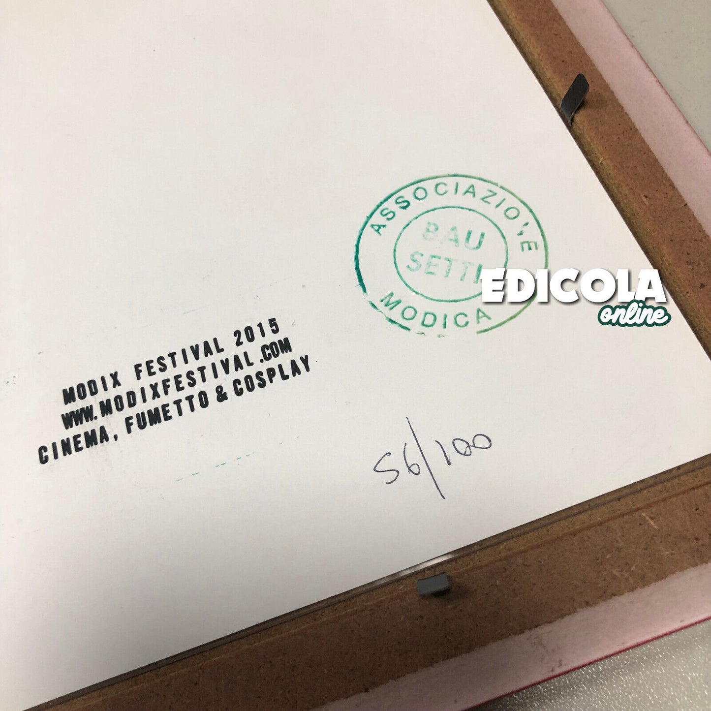 Tirage au format A4 signé par Paolo Mottura, (avec cadre rouge comme photo complémentaire), créateur de la parodie "Dylan Top" de Mickey Mouse, dans laquelle le personnage endosse le rôle d'enquêteur occulte. La signature est accompagnée d'une dédicace spéciale avec l'écriture "à Angelo". Cette planche fait partie d'une série limitée de 56/100 exemplaires, chacun marqué d'un cachet d'authenticité du Modica Cinema, Comics and Cosplay Festival 2015, connu sous le nom de Modix Festival 2015.