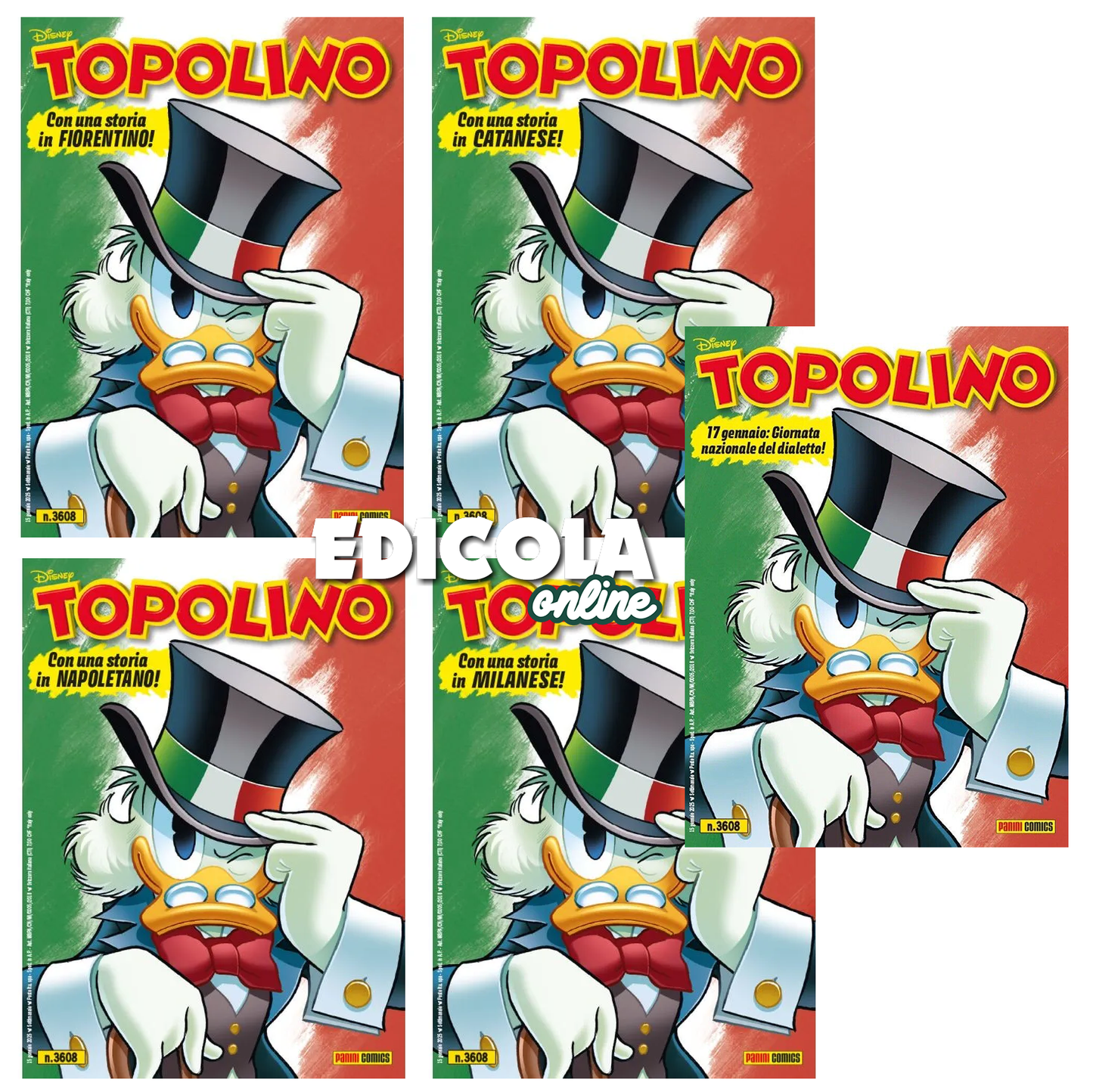 Per l’occasione, Topolino 3608 uscirà in cinque versioni, che si differenzieranno per il fatto che una storia contenuta all’interno dell’albo, oltre alla versione in italiano corrente, sarà tradotta in quattro dialetti: Campano, Lombardo, Siciliano e Toscano. Le cinque versioni di Topolino avranno ciascuna una versione della storia: potrete dunque acquistare la versione con storia in italiano, le versioni con la storia nel dialetto che preferite, o tutte e cinque!