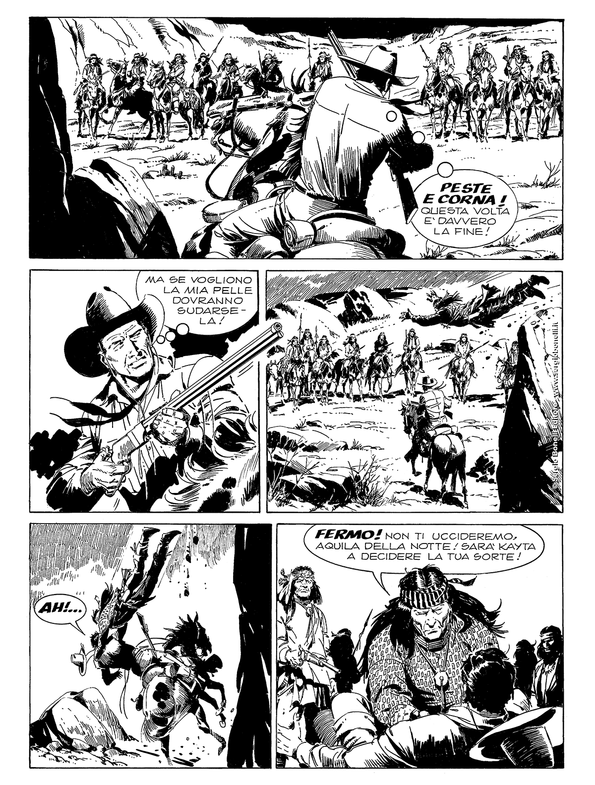 Sui pacifici Mescaleros di Durango sta per abbattersi l'iniqua rappresaglia dell'esercito. Non loro, infatti, ma i ribelli guidati da Kayta sono i responsabili del massacro della pattuglia di perlustrazione proveniente da Fort Buffalo. Tex, che è riuscito a strappare Carson dalle mani degli Apaches di Kayta, deve mettere sull'avviso la gente del capo Durango, ma sulla sua testa pende un'accusa d'omicidio e ha dato la sua parola d'onore al tenente che lo ha catturato, promettendogli che non tenterà la fuga...