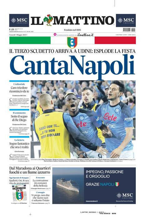 La prima pagina de Il Mattino apre con il titolo “Canta Napoli”: Il terzo scudetto arriva a Udine, esplode la festa… Grazie ai Campioni D’Italia.