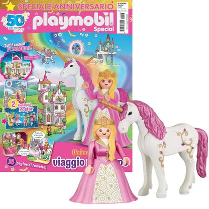 Un numero speciale per festeggiare i 50 anni di PlayMobil. In regalo un fantastico personaggio Playmobil: Cavallerizza con Unicorno.